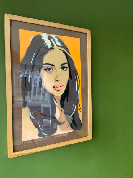 Portrait of Cindy. Spray paint on 300gsm paper A2 size (42x59cms) original painting. Unframed. Signed on reverse. Stencil portrait. Pop art/ retro style.