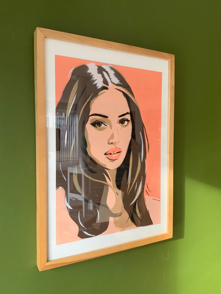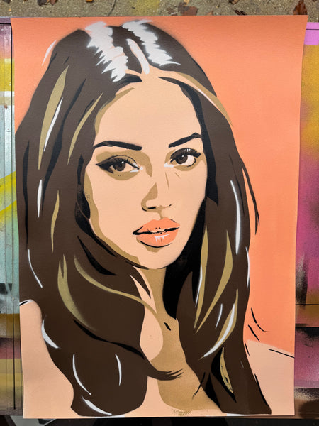 Portrait of Cindy. (Coral) Spray paint on 300gsm paper A2 size (42x59cms) original painting. Unframed. Signed on reverse. Stencil portrait. Pop art/ retro style.