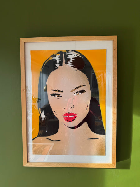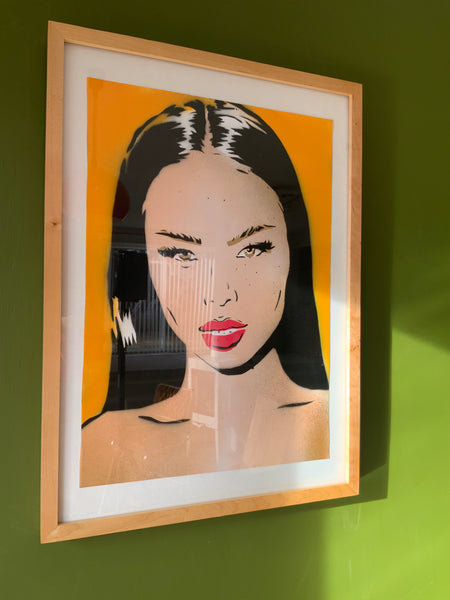 Original painting of Jade. (Orange background) Pop art stencil portrait. Spray paint on 300gsm paper A2 size (42x59) Signed on reverse. Unframed